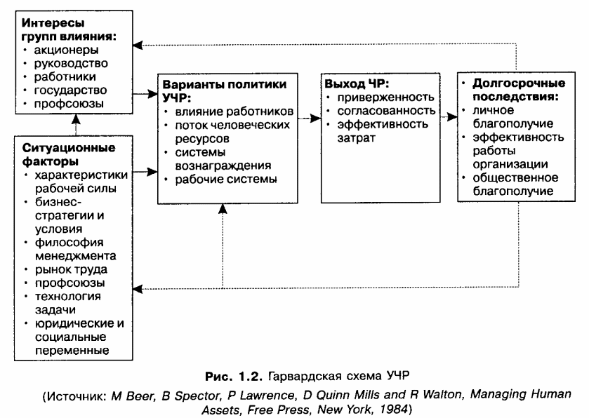 представители гарвардской школы – М. Биер др., которые разработали то, что П. Боксал называет Гарвардской схемой. Эта схема основана на убеждении, что проблемы исторически сложившегося управления персоналом могут быть разрешены: Когда генеральные директора выработают свою точку зрения на то, каким образом они хотят вовлекать работников в деятельность предприятия, как развивать их с помощью этого предприятия и каким образом теория и практика УЧР могут достичь этих целей.