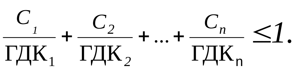 Гранично допустима концентрація шкідливої речовини в повітрі робочої зони - концентрація речовин, яка за умовами регламентованої тривалості її щоденної дії при 8 годинній роботі не може викликати в осіб, що піддаються впливу її, захворювань або відхилень у стані здоров'я. Залежно від особливостей дії на організм шкідливих речовин для них встановлюються ГДК двох типів: максимальна разова і середньозмінна.Фактичний вміст шкідливої речовини у повітрі робочої зони не повинен перевищувати його ГДК. При одночасній наявності у повітрі декількох шкідливих речовин односпрямованої дії сума відношень фактичних концентрацій кожного з них до їх ГДК не повинна перевищувати одиниці: