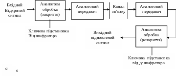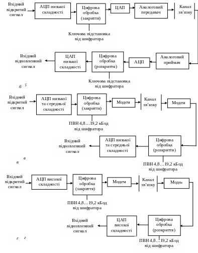 Дискретні системи (рис. З, в і г) не передають елементів аналогового вихідного сигналу. Мовні компоненти кодуються в цифровий потік даних, який змішується з псевдовипадковою послідовністю, створеною ключовим генератором за одним із криптоалгоритмів. На приймальному кінці відбувається зворотне перетворення.