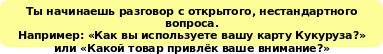 Это вопросы, которые начинаются с вопросительного слова («где», «когда», «как», «какой» и т.п.) и предполагают развернутый ответ. Это вопросы для сбора максимального количества информации, помогают «разговорить» Покупателя. Например: «Какой товар привлек Ваше внимание?»