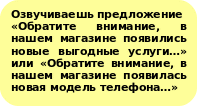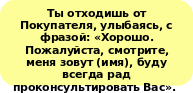 - •Вот фразы, рекомендуемые в Компании, для установления контакта с покупателем у терминала, в очереди в кассу или просто в торговом зале: