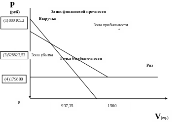 Вывод по модели Вида 1: в нашем варианте критическая точка безубыточности означает, что выпуск модели Вида 1 в количестве 937,35 единиц и объем продаж этого изделия в размере 528823,53 рублей. Эти минимальные величины являются критическими, и уменьшение показателей приведет к появлению убытка, повышение показателей выше критической точки увеличивает прибыль предприятия. Разница между фактическим объемом продаж и критической точкой безубыточности является запасом финансовой прочности предприятия. В нашем примере по изделиям модели Вида 1предполагает годовой выпуск продукции в количестве 1560 единиц и объем продаж в размере 880105,2 рублей, таким образом, запас финансовой прочности равен 880105,2/528823,53 = 1,66, т.е. на 1,66 больше, чем в критической точке. Это свидетельствует о значительном запасе финансовой прочности предприятия (1,66>1,4).