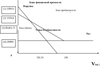 Вывод по модели Вида 3: В нашем варианте точка безубыточности означает, что выпуск изделия модели Вида 3 в количестве 326,54 единиц и объема продаж этого изделия 85425,71 рублей. По изделию модели Вида 3 предполагается годовой выпуск в количестве 240 единиц и объема продаж 158916 рублей, таким образом, 158916/85425,71 = 1,86, т.е. в 1,86 раз больше, чем в критической точке. Это свидетельствует о значительном запасе финансовой прочности предприятия(1,86>1,4).