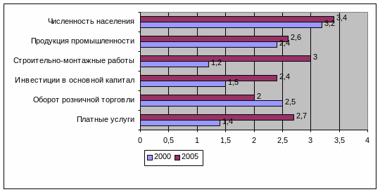 Социально-экономическое развитие г. Бердска в течение последних лет характеризуется стабильно положительной динамикой. Растет вклад города в экономику области (рисунок 1). Из рисунка видно, что по сравнению с 2000 годом в 2005 наиболее явное увеличение удельного веса г. Бердска в экономике НСО произошло в объемах строительно-монтажных работ (на 1.8%), платных услуг (на 1,3%), инвестиций в основной капитал (0,9%), однако произошло сокращение