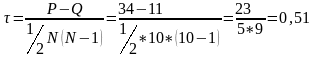 Определяются значения совпадений и расхождений по каждому рангу второго замера. Рассмотрим самый первый ранг этого замера – ранг 3. Определим, сколько ниже этого ранга (при определении совпадений и расхождений используется только столбец рангов второго замера) расположено значений, превышающих 3. Таких значений 7 (это ранги 6, 4, 5, 10, 9, 8, и 7). Поэтому в столбце совпадений в соответствующей строчке указываем 7. Затем считаем количество рангов, меньших 3. Таких рангов 2 (это значения 2 и 1). Соответственно, в столбике расхождений мы указываем 2. После этого переходим к следующему рангу 2 замера – рангу 2. Ниже его расположено также 7 рангов, превышающих рассматриваемое значение. Вносим цифру 7 в столбец совпадений. В столбце расхождений указываем 1, так как единственное значение (ранг 1) меньше рассматриваемого ранга 2. У следующего ранга (это ранг 1) ниже находятся 7 значений, превышающих его и нет ни одного значения меньше. У ранга 6 следующего по расположению) числу совпадений 4 (это ранги 10, 9, 8 и 7) и количество расхождений 2 (ранги 4 и 5). Таким образом подсчитывается для каждого ранга 2 замера число совпадений и расхождений. После того как все значения определены, находится итоговое, суммарное значение расхождений. В нашем примере суммарное значение P (совпадений) равно 34. Суммарное значение Q (расхождений) равно 11. Найденные значения P и Q представляем в расчетную формулу и находим значения коэффициента корреляции:
