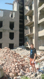 Т.5 А и Б. Как видно на фотографии с началом эксплуатации жилого дома №90 на ул. Нахимова разные корпуса жестко связаны между собою начали неравномерно оседать. До признания полной аварийности был устроен вертикальный армопояс ( фото Б) из сварных металлоконструкций для предотвращения потери пространственной жесткости. Как видно на фото А вследствие разной усадки обрушение части стен и перемычек между жестко связанными корпусами 1 и 2 дома №90.