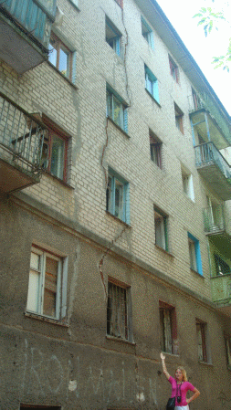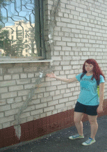 Т.6. Не стабильность склона привела к откалыванию угла несущей стены школы №57. Четко видна вертикальная трещина, пронзающая 3 этажа. Установлены гипсовые метки-маяки фиксирующие ее увеличение.