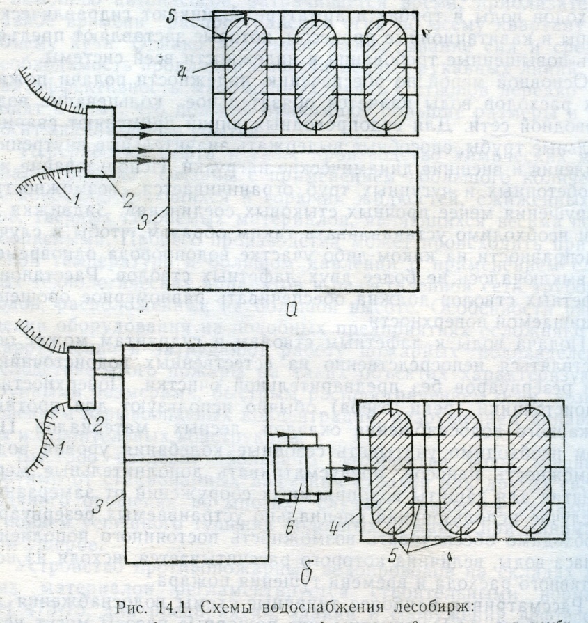 Рассматривая наиболее типичные схемы водоснабжения лесобирж (рис. 1), отметим, что пожарные насосы могут устанавливаться как на НС-I подъема (1, а), так и на НС-II (1, б).