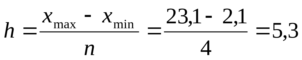 В качестве группировочного признака возьмем уставный капитал. Образуем четыре группы банков с равными интервалами. Величину интервала определяем по формуле: