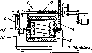 1 2, 3 - контактні пружини; 4 - рукоятка, 5 - зубчасте колесо: 6 - вісь зубчастого колеса: 7-пружина: 8 - якір; 9 - контактна група; Л1,Л2 - лінія.