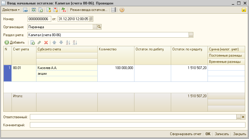 Рис. 7.15. Документ «Ввода начальных остатков: Капитал».