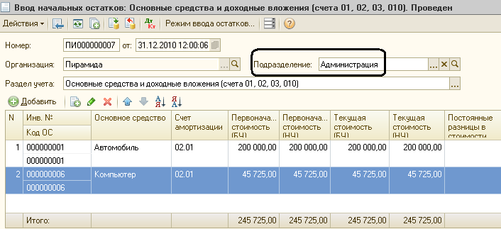 В итоге документ ввода остатков по основным средствам должен выглядеть как на рисунке 7.16.
