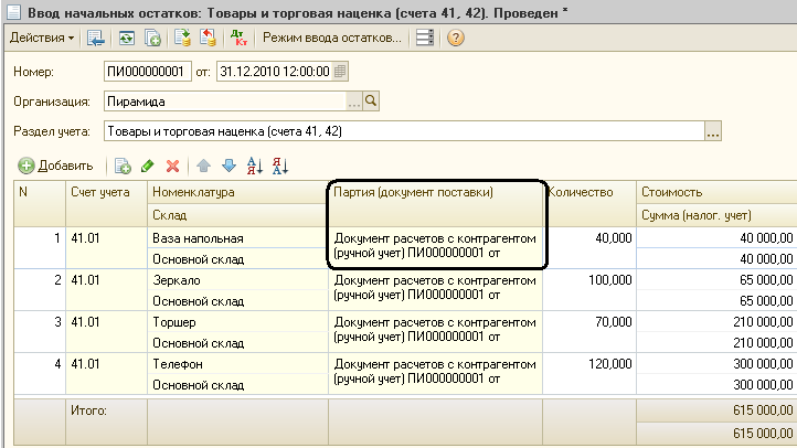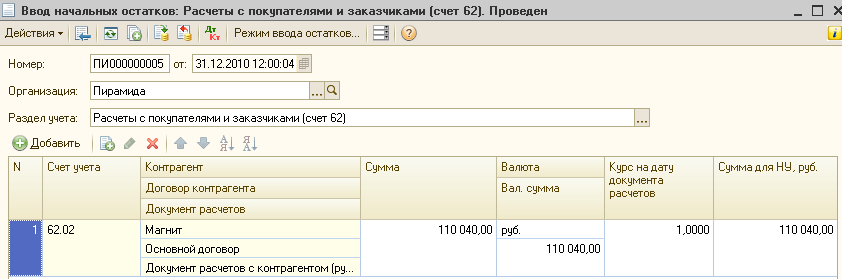 Организация ООО «Пирамида» осуществляла свою деятельность до ввода в эксплуатацию программы «1С:Бухгалтерия предприятия». И поэтому по некоторым счетам у нее будут остатки.