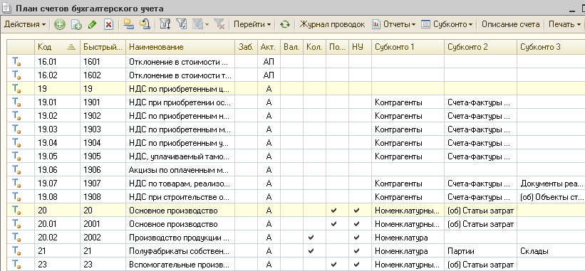Балансовые и забалансовые счета компьютерного плана счетов имеют те же номера, которые установлены единым Планом счетов. Действующее законодательство РФ предусматривает, что остатки и обороты по синтетическим и аналитическим счетам должны совпадать. Для выполнения этих требований план счетов настроен таким образом, чтобы запретить использовать в проводках счета, к которым открыты субсчета.