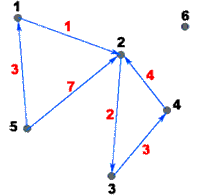 Следующий тип хранения графа в памяти компьютера - список дуг. Чаще всего это двумерный массив размером 3*E, в первой строке которого хранится информация, из какой вершины начинается дуга, во второй - в какой кончается, а в третьей строке - вес дуги. Опять же разберёмся на примере (все тот же граф):