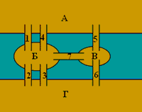 Итак, граф - это множество точек (вершин, объектов) и соединяющих их путей (линий, дуг, рёбер). Абсолютно неважно, какой вид имеют эти линии, и как точки расположены в пространстве. Идея графа — это набор каких-то объектов, с описанными связями между ними. В самом простом случае связь может быть, а может не быть. В нашем случае вершинами являются части суши города, а ребрами – мосты. На рисунках приведено изображение мостов в виде карты (слева) и в виде графа (справа). |