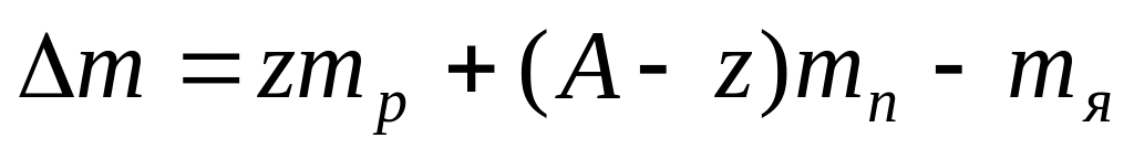 где z – зарядовое число (число протонов в ядре); А – массовое число (число нуклонов в ядре); (А – z) – число нейтронов в ядре; тр – масса протона; тп – масса нейтрона; тя – масса ядра.