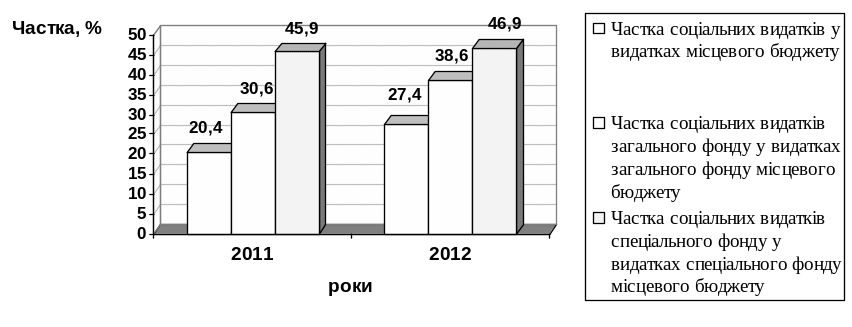 Рис. 10.1. Динаміка частки соціальних видатків у видатках ______________ бюджету упродовж 2011–2012 рр., %