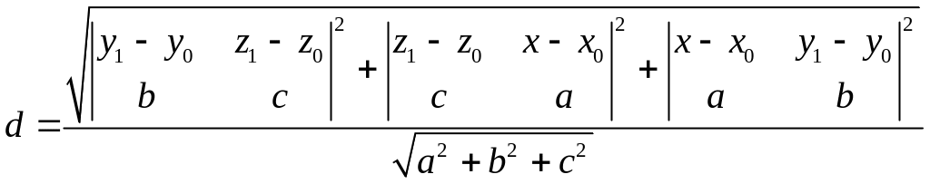 Визначимо відстань між точкою і прямою l. Шукана відстань d є висотою паралелограма, побудованого на векторах і . Нехай . Оскільки дорівнює площі паралелограма, то , тобто