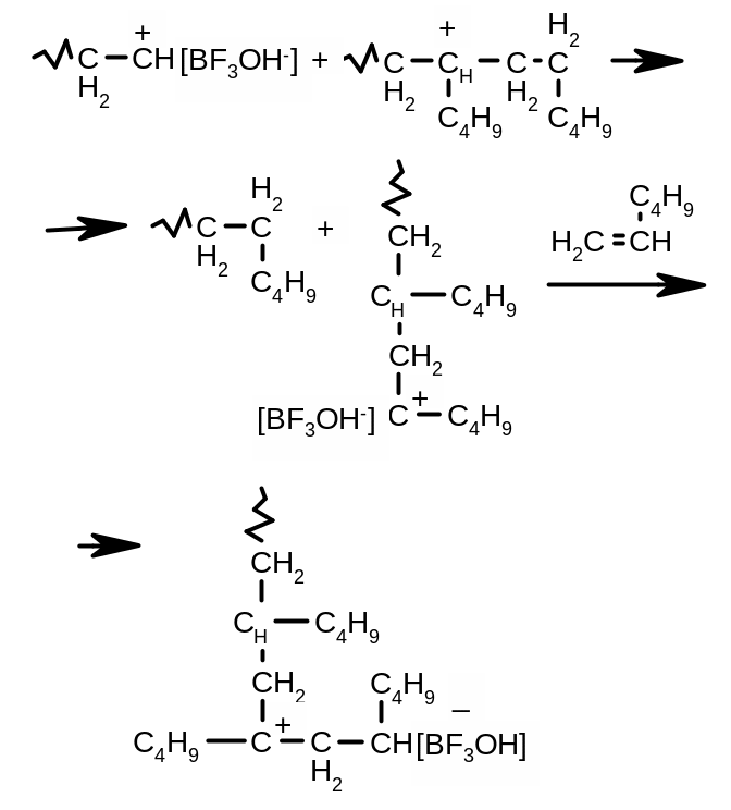 Ионную полимеризацию делят на анионную и катионную. Для катионной полимеризации не характерен кинетический обрыв цепи, который характерен для радикальной полимеризации. Эта стадия требует большой энергии(как и в радикальной полимеризации) наблюдается передача цепи на мономер и растворитель.