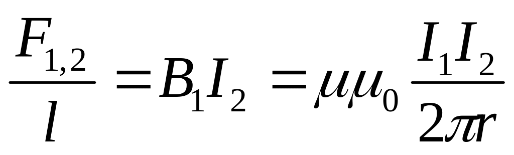 Формула (13) служит также для определения силы тока в 1А - это ток, который проходя по двум параллельным проводникам, находящимся на расстоянии r = 1 м, вызывает силу взаимодействия 2.10-7 Н на каждый метр провода.