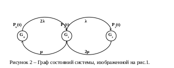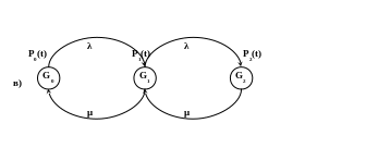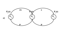 Дуге, идущей из состояния G2 в состояние G1 приписано значение интенсивности восстановления 2μ, что означает условие неограниченного восстановления: одновременно могут восстанавливаться обе отказавшие системы (и основная и резервная). В этом случае одновременно работают две бригады ремонтников.