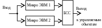 Схема БСС считается абсолютно надежной. Система работоспособна только в том случае, если работоспособны обе микроЭВМ. Это означает, что с точки зрения безотказности мы имеем логически последовательное соединение каналов (см. лабораторное занятие № 2).