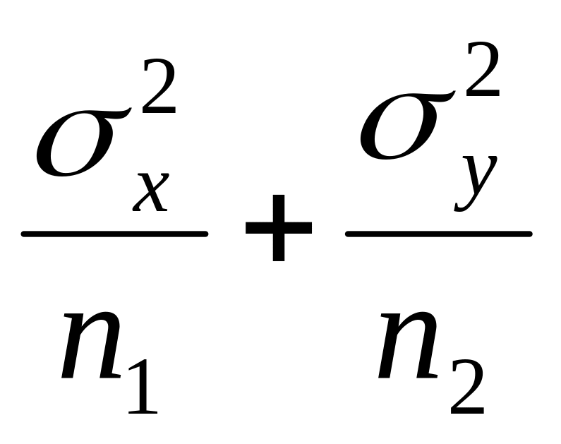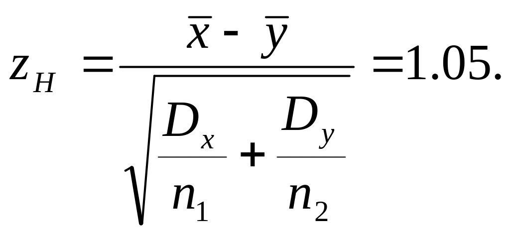 Пример. По двум извлеченным выборкам, извлеченным из двух нормальных генеральных совокупностей, объемы которых соответственно равны n1 = 60 и n2 = 50 определены выборочные средние =1250 и =1275. Генеральные дисперсии известны: Dx = 120, Dy = 100.