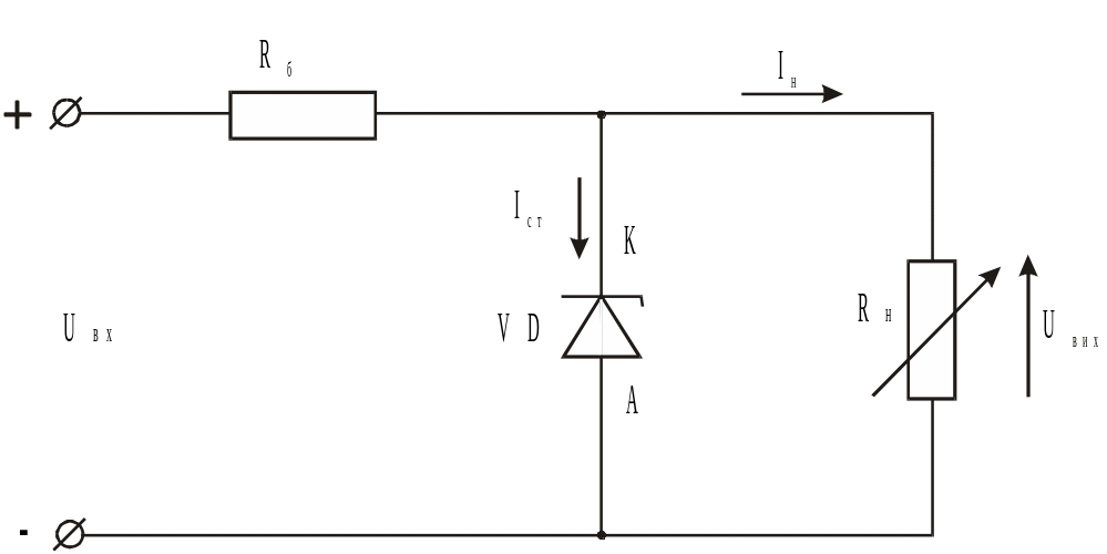 Для нормальної роботи стабілізатора струм у навантаженні повинен бути меншим від струму через стабілітрон Iн < Iст.