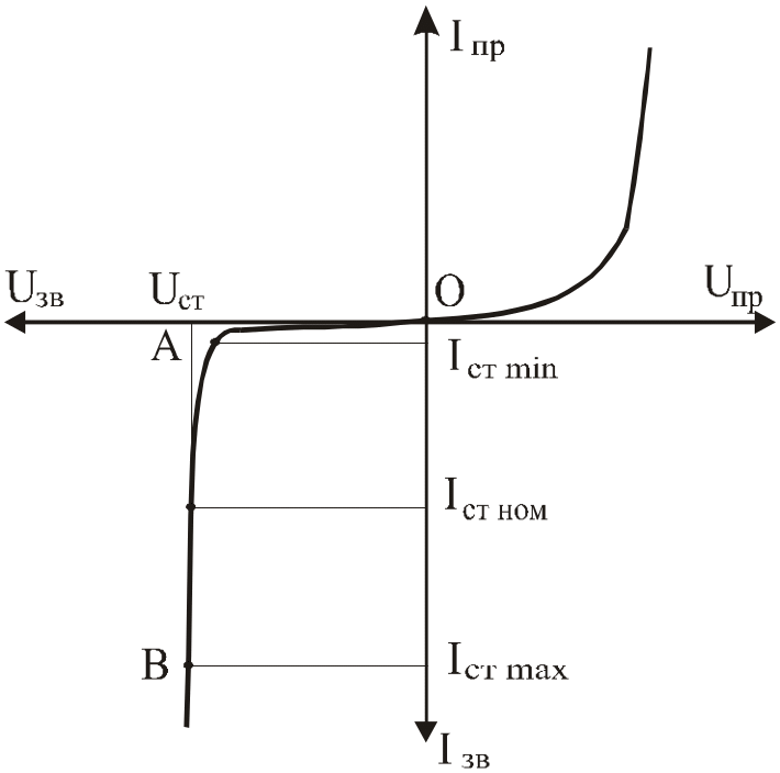 Робочою ділянкою характеристики є відрізок АВ , що проходить майже паралельно до осі струму і відповідає режиму неруйнівного електричного пробою у стабілітроні. Як видно з рис. 19.1, в області електричного пробою спад напруги на стабілітроні Uст залишається практично постійним при значних змінах струму стабілізаці Iст.