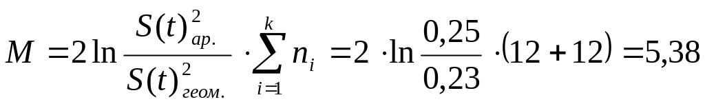 При сравнении двух дисперсий и равном числе уровней средние арифметическая и геометрическая будут не взвешенные и формулы для их расчета примут вид: