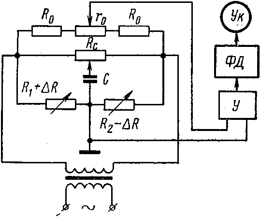 Зависимость омического сопротивления некоторых сплавов (константан, нихром, платинородий) от величины упругих деформаций используется для измерения усилий в тензометрических преобразователях с проволочными, фольговыми или полупроводниковыми тензорезисторами. Тензорезистор приклеивается к несущему нагрузку упругому элементу с близкими к тензоматериалу коэффициентами температурного расширения и испытывает одинаковые с ним упругие деформации под действием приложенных к несущему элементу сил. Сам тензорезистор включается в измерительный резисторный мост для преобразования результата (изменения омического сопротивления) в электрический сигнал. Полупроводниковые тензорезисторы изготавливаются из монокристаллов кремния, германия, арсенида галлия и др. – они отличаются высоким коэффициентом тензочувствительности (-200 – +850) при малых размерах (до 2,5 мм). Ниже на рисунке приведена типовая мостовая схема с тензорезисторами R1 и R2, один из которых испытывает деформацию растяжения, а другой деформацию сжатия: такое дифференциальное включение позволяет устранить температурную погрешность и вдвое увеличить чувствительность. Снимаемый с измерительной диагонали моста сигнал требует усиления по мощности, поэтому подается на указатель Ук через усилитель У и фазочувствительный демодулятор ФД.