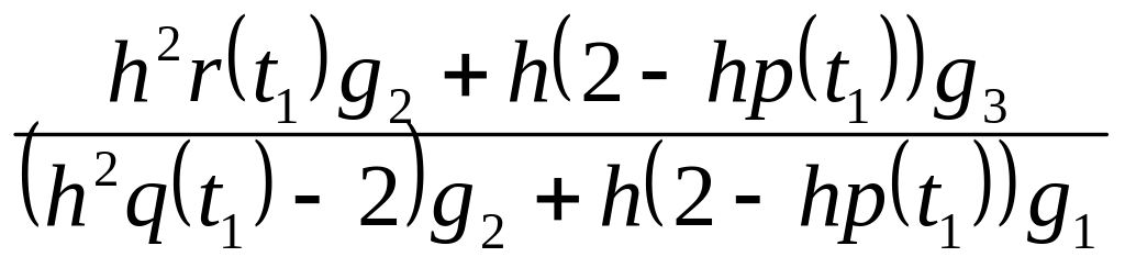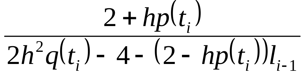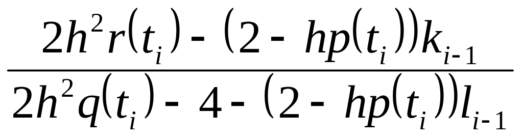 При i=1 уравнение f(t0)=k0–l0f(t1) приводится к виду f(t1)=k1–l1f(t2), а для произвольного значения i получим f(ti)=ki–lif(ti+1). Пограничные коэффициенты ki, li вычисляются по рекуррентным формулам: