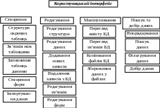 Крім того, будь-яка СУБД забезпечує певні режими роботи через відповідну систему вказівок. Типовими режимами роботи з реляційною базою даних є: створення; редагування; маніпулювання; пошук та добір інформації в базі даних. При цьому можна подати відповідну схему (рис. 1), яку учні поступово будуть доповнювати.