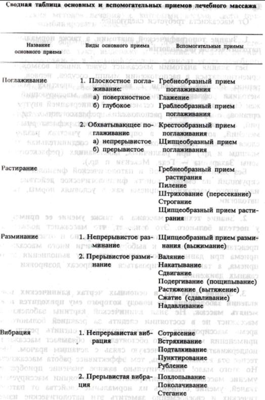 Похлопывание: техника выполнения: приём выполняется ладонной поверхностью кисти при слегка согнутых пальцах или кулаком. Показания: применяется на участках, имеющих большой мышечный слой, например, на ягодицах, спине. Поколачивание: Техника выполнения: Приём выполняется кулаком- его локтевым краем или тыльной поверхностью пальцев, сжатых в кулак. Показания: оказывает более энергичное воздействие на ткани, чем рубление и похлопывание. Стегание: Техника выполнения: Приём производят одним или несколькими пальцами, а также всей ладонью, причём удар приходится не отвесно, а в косом направлении. Показания: Применяется на больших поверхностях (спина, живот) обычно при ожирении и на малых поверхностях при Рубцовых изменениях кожи. Методические указания: Выполнение непрерывистой вибрации требует большого навыка и умения. При неправильном выполнении этого приёма, особенно при длительном его применении, появляются боли и судорожное стягивание пальцев, спазм сосудов, нарушения чувствительности и другие расстройства. Боли могут распространяться по всей руке и с течением времени привести к вибрационной болезни. Для правильного освоения приёма непрерывистой вибрации рекомендуется следующее упражнение: положив концы пальцев на поверхность небольшого столика, в центре которого стоит стакан, наполненный водой, производят непрерывистые колебательные движения. Если вибрация выполняется правильно, то поверхность воды в стакане почти неподвижна, лишь в центре наблюдается слабое движение. Если вибрация выполняется неправильно, то вся масса воды приходит в движение, переливаясь через край стакана. Давление на ткани во время вибрационных движений не Должно быть болезненным. При выполнении непрерывистой вибрации сила колебательных движений зависит от угла наклона пальцев кисти к массируемой поверхности. Чем больше угол наклона пальцев к массируемой поверхности приближается к девяноста градусам, тем воздействие на ткани глубже и энергичнее, и, наоборот, чем угол Меньше, тем действие вибрации поверхностнее и мягче. При выполнении прерывистой вибрации (рубление, похлопывание) сила, мягкость и эластичность удара зависят от следующих моментов: