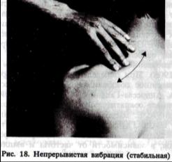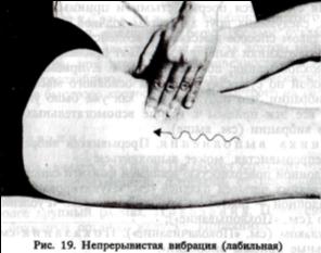 При выполнении непрерывистой вибрации рука массажиста и массируемая часть тела составляют как бы одно целое. Непрерывистая вибрация может выполняться в форме плоскостного или обхватывающего поглаживания, а также растирания. Техника выполнения: Непрерывистая вибрация выполняется: ладонной поверхностью концевой фаланги одного пальца (точечная вибрация). Показания: Применяется при необходимости воздействия на небольшую поверхность- вибрация нерва у места его выхода (надглазничный нерв). Ладонной поверхностью двух пальцев (большого и указательного) или трёх пальцев (указательного, среднего и безымянного) и, наконец, большого и остальных четырёх пальцев. Показания: Выполняется большим и средним пальцем в области спины, в местах выхода нервных корешков, на лице в области выхода нервных окончаний на поверхность и так далее. Большим и указательным пальцами при массаже легко смещающихся органов, например, гортани. Указательным, средним и безымянным- при необходимости более глубокого воздействия. Большим пальцем и остальными четырьмя пальцами- при массировании мышц гонечности (икроножные мышцы). Ладонью (опорная поверхность), кулаком. Показания: применяется при массаже живота, спины, мышц бедра. Непрерывистая вибрация может выполняться одной или обеими руками. Движения как одной, так и обеими руками могут производиться: продольно или поперечно, зигзагообразно или спиралевидно. Прерывистая вибрация: При выполнении прерывистой вибрации рука массажиста, соприкасаясь с массируемой частью тела, Каждый раз отходит от неё, в результате чего вибрационные движения становятся прерывистыми и принимают характер отдельных, следующих друг за другом толчков. При таком способе массажного воздействия вибрация в зависимости от техники выполнения может применяться в виде рубления, похлопывания, поколачивания, то есть приёмов, представляющих собой по существу варианты основного массажного приёма- вибрации, что побудило нас, как уже было указано выше, отнести все эти приёмы к группе вспомогательных массажных приёмов вибрации. Техника выполнения: прерывистая вибрация, так же как и непрерывистая, может выполняться: ладонной поверхностью концевой фаланги одного, двух, трёх или последних четырёх пальцев, ладонью- локтевым краем ладони, всей ладонью, кулаком. Прерывистая вибрация может выполняться одной или обеими руками. Массажные движения при выполнении этого приёма производятся: продольно или поперечно, зигзагообразно или спиралевидно.
