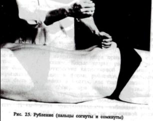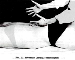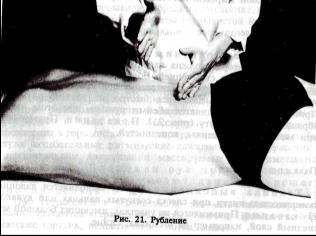 Рубление: техника выполнения: приём выполняется локтевым краем кисти, которая должна находиться в среднем положении между пронацией и супинацией. Во время выполнения массажного движения локтевой сустав согнут под прямым или тупым углом. Руки должны двигаться быстро, а главное, ритмично. Приём обычно выполняется обеими руками, при этом ладони обращены друг к другу (рис. 21). Показания: применяется при массировании спины, конечностей.