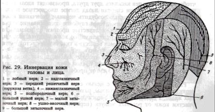 Иннервация: все мимические мышцы лица иннервируются двигательными ветвями лицевого нерва (n. Facialis), жевательные мышцы- двигательными ветвями тройничного нерва (N. Trigeminus) (рис. 29).