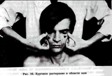 Массаж щёк: Положение массирующих рук: большие пальцы обеих рук устанавливают под подбородком, остальные своей ладонной поверхностью охватывают нос, затем, продвигая большие пальцы скользящими движениями до углов нижней челюсти, ладонями обеих рук производят лёгкое поглаживание кожи щёк по направлению вверх через скуловую дугу к ушам до височных областей и отсюда к углам рта. Приём повторяют 3-4 раза (рис. 38). Круговое растирание в области щёк производится тыльной поверхностью концевой и средней фаланги последних четырёх пальцев в направлении от края нижней челюсти к носу. Этот приём повторяют также 3-4 раза. При разминании в области щёк не всегда легко отделить поверхностный слой кожи от глубокого мышечного. Для этой цели Х. Б. Слетов (1928) рекомендует следующий приём: кожу в области щёк захватывают Большим и указательным пальцами и быстрыми движениями отжимают. При выполнении этого приёма кожа должна выскользнуть из-под пальцев так, как выскальзывает косточка из зрелой сливы при надавливании на неё. Выполнение этого приёма не должно превратиться в щипание. Сотрясение в области щёк производится ладонными концами пальцев или тыльной поверхностью средних фаланг, сжатых в кулак (рис. 39). Прерывистое надавливание на этом участке выполняется концами большого и указательного пальцев. Поколачивание осуществляется ладонной поверхностью концов второго-четвёртого пальцев.