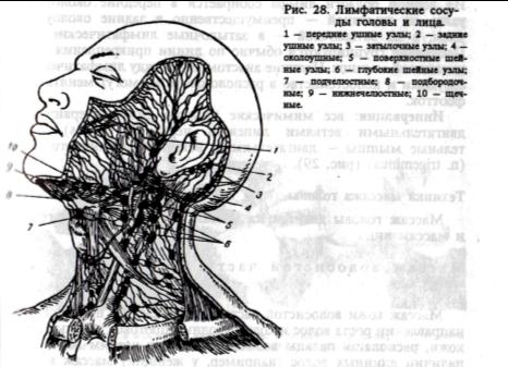 Лимфатические сосуды головы и лица (рис. 28), обильно анастомозируя, собираются к трём группам лимфатических узлов. Из лобной области лимфа собирается в передние околоушные узлы, из теменной- преимущественно в задние околоушные узлы, а на затылочной- в затылочные лимфатические узлы. Последние группируются обычно по линии прикрепления трапециевидной мышцы. Наличие анастомозов между лимфатическими сосудами и непостоянство в расположении их могут менять лимфоотток.