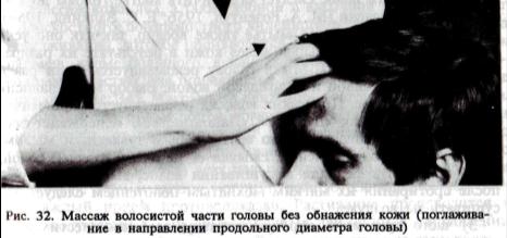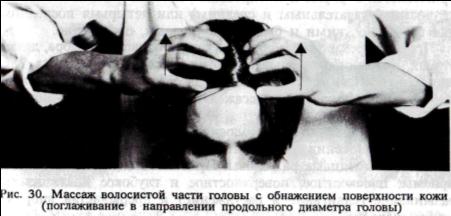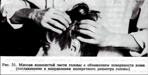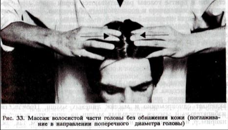 После поглаживания производят полукружное или зигзагообразное растирание кожи головы ладонной поверхностью концевых фаланг второго-третьего пальцев правой руки, при этом пальцы левой, отступя на 2-3 сантиметра от пробора, придерживают кожу головы. Растирание применяется с целью ещё большего возбуждения нервных окончаний в коже головы, размельчения отложения сальных желёз, а также ещё более энергичной, чем при поглаживании, очистки кожи от роговых чешуек (перхоти). Разминание применяется в виде сдвигания кожи. При выполнении этого приёма большие пальцы обеих рук, слегка надавливая на кожу, смещают её в направлении от себя к себе. Таким образом постепенно охватывается вся поверхность головы. С целью усиления подвижности кожи, улучшения местного кровообращения в тканях волосистой части головы сдвигание кожи комбинируют с её растяжением. Прерывистая вибрация в области волосистой части головы применяется в форме пунктирования, которое выполняется двумя пальцами (указательным и средним) или четырьмя последними пальцами короткими и быстрыми ударами, поочерёдно. Промассировав таким образом кожу в области пробора, делают второй пробор параллельно первому, отступя от него на 2 сантиметра вправо или влево, повторяя те же массажные приёмы. По такой же методике производят массаж в направлении поперечного диаметра головы (рис. 31).