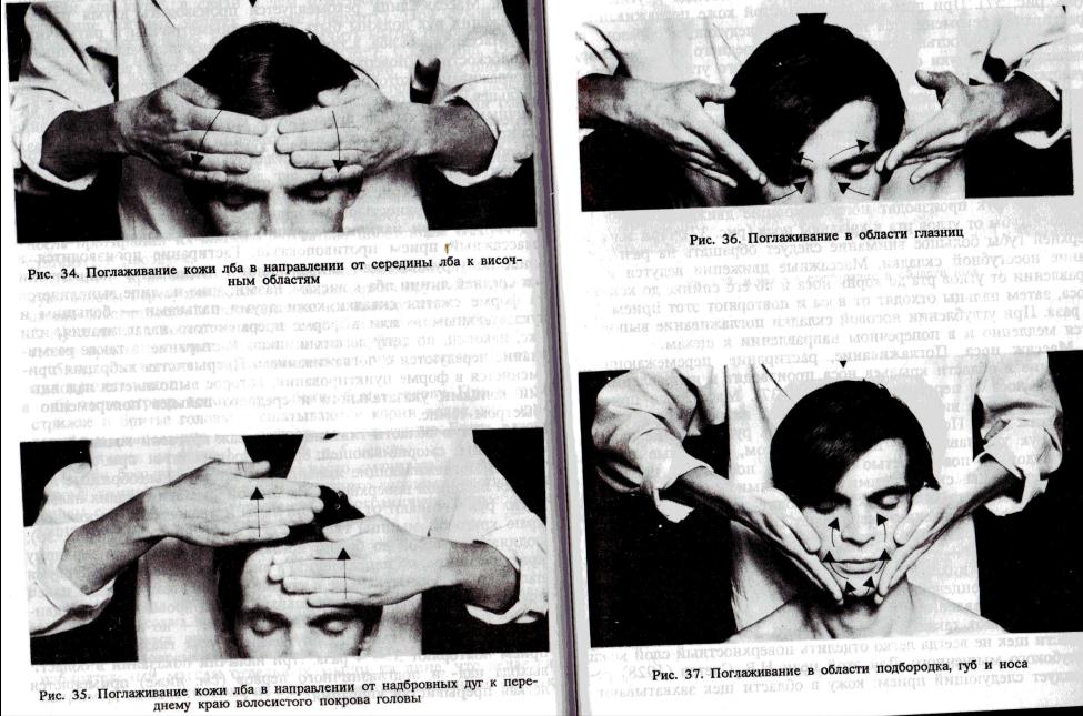Массаж лица состоит из: массажа кожи лица и лицевых мышц, массажа важнейших нервных окончаний. Массаж кожи лица и лицевых мышц: массаж кожи лица включает одновременно и массаж лицевых мышц. Произвести избирательный массаж отдельных мышц на лице, что делается, например, на конечностях, не представляется возможным, так как, массируя кожу, мы массируем и мышцы лица, при этом некоторые из лицевых мышц, например, лобная, скуловая, квадратная мышца верхней губы, отчасти треугольная, более доступны для массажного воздействия, чем другие мышцы лица. В зависимости от анатомических особенностей массируемого участка лица массаж можно производить ладонной поверхностью всех пальцев, кроме большого, который в этом случае играет роль опоры, концом большого или среднего пальца, или двумя пальцами- средним и безымянным. Массаж лица рекомендуется производить двумя руками. Движения рук должны быть строго симметричны и ритмичны.