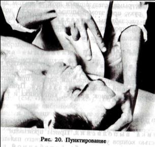 Вспомогательные приёмы вибрации, как и приёмы поглаживания, мы разделяем на две группы: одна из них представляет собой варианты непрерывистой вибрации (сотрясение, встряхивание, подталкивание), другая- варианты прерывистой вибрации (пунктирование, рубление, похлопывание, поколачивание, стегание). Сотрясение: техника выполнения: на конечности, например, при массировании бедра или голени, приём выполняется следующим образом: располагая концы большого и указательного пальцев или ладони с обеих сторон массируемого сегмента, массажист производит в горизонтальном или вертикальном направлении быстрые колебательные ритмические движения. При сотрясении в горизонтальном направлении массируемые ткани смещаются вправо и влево. Движения рук при выполнении этого приёма напоминают движения решета при просеивании муки. При сотрясении в вертикальном направлении массируемые ткани смещаются вверх и вниз. Показания: применяется при массаже гортани, полости носа, глотки, живота. Встряхивание: техника выполнения: при выполнении этого приёма, например, на верхней конечности, берут обеими руками кисть больного и быстрыми, следующими друг за другом движениями встряхивают руку, при этом мышцы конечности должны быть максимально расслаблены. Показания: применяется на конечностях для быстрого кровообращения, быстрого их согревания. Подталкивание: техника выполнения: по своему характеру этот приём приближается к встряхиванию, отличаясь от последнего амплитудой колебательных движений, которая при подталкивании имеет более крупный размах. Показания: применяется при массаже брюшных органов: желудка, кишечника и тому подобных. Пунктирование: техника выполнения: приём производится ладонной поверхностью концов указательного и среднего пальцев, подобно тому, как выбивается дробь барабанной палочкой (рис. 20). Показания: применяется на лице, в местах выхода нервов: подглазничного, подбородочного и так далее, а также там, где мало подкожной жировой клетчатки, например, на голове.