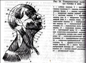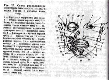 Мышцы лица, состоящие из дугообразных или круговых волокон и не имеющие ни апоневроза, ни фасций, расположены преимущественно вокруг отверстий глаз, рта, носа и ушей. Принимая участие в замыкании или, наоборот, расширении этих отверстий, изменяя их форму на лице и передвигая кожу с образованием разных складок, эта мимическая мускулатура придаёт лицу определённое выражение, соответствующее тем или другим эмоциям. Начинаясь на костях, мышцы оканчиваются в коже, вследствие чего их сокращение обусловливает смещение кожи и, наоборот, смещая кожу на лице, мы тем самым воздействуем и на отдельные мышцы лица (рис. 26-27).