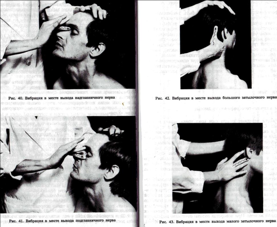 Массаж важнейших нервных окончаний на лице: из нервов, наиболее часто поражаемых и имеющих выход на поверхность головы и лица, массируют в местах выхода конечные ветви тройничного нерва: надглазничный (n. Supraorbitalis), подглазничный (n. Infraorbitalis), подбородочный (n. Mentalis).