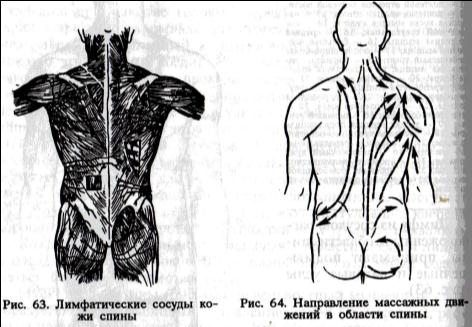 При массировании в первую очередь применяется поверхностное, а затем плоскостное глубокое и обхватывающее поглаживание ладонями обеих рук, возможно шире обхватывая спину. Направление массажных движений- от крестца и гребня подвздошных костей параллельно остистым отросткам позвоночника вверх до надключичных ямок, после чего ладони возвращаются в исходное положение и поглаживающие движения, несколько отступя от позвоночника, продолжают до подкрыльцовых впадин(рис. 64). Массаж в области крестца начинают с обвода крестца, применяя попеременно растирание и поглаживание. Затем массируют латеральные края крестца и в области crista sacralis, используя те же массажные приёмы. Заканчивается массаж крестца глубоким поглаживанием, которое начинают снизу от крестца и доходят до trigonum lumbale. При массировании спины из вспомогательных приёмов поглаживания применяют гребнеобразное поглаживание или глажение.