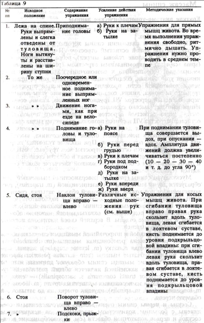 Методические указания: При массаже спины похлопывание, рубление в области межлопаточного пространства следует производить осторожно, учитывая их возбуждающее влияние на лёгкие и сердце. Нужно избегать поколачивания, рубления, похлопывания в области почек, если это не вызывается специальными показаниями. В процессе проведения массажа спины применяются активные и пассивные движения, позволяющие укрепить суставносвязочный аппарат позвоночника, а также воздействовать на глубокие сосуды и нервы спины. При выборе движений для упражнения мышц спины следует иметь в виду, что движения туловища вызывают прилив крови к брюшной и тазовой полостям, а также в большой степени возбуждают дыхательную и сердечную деятельность. (Таблица 10)
