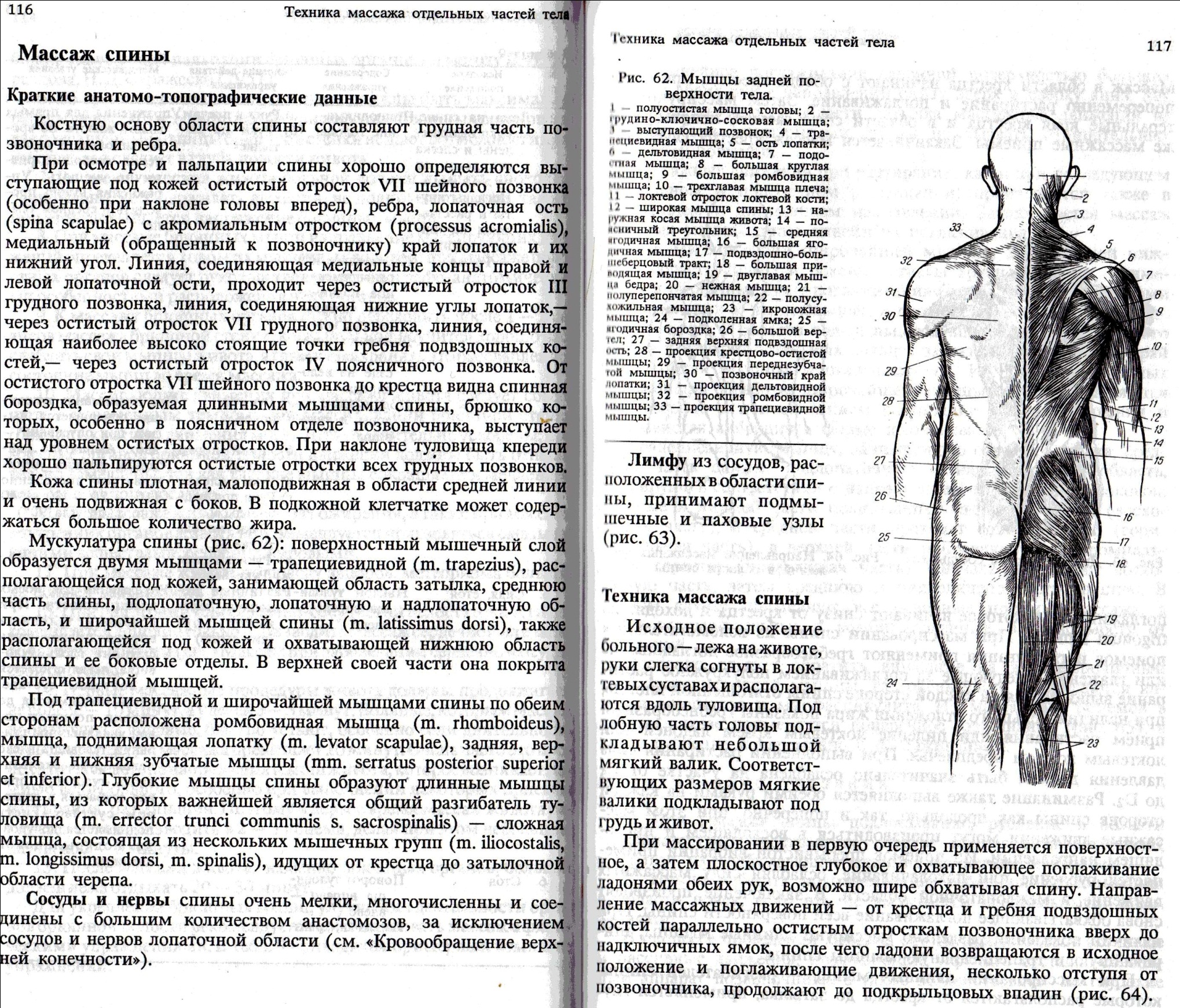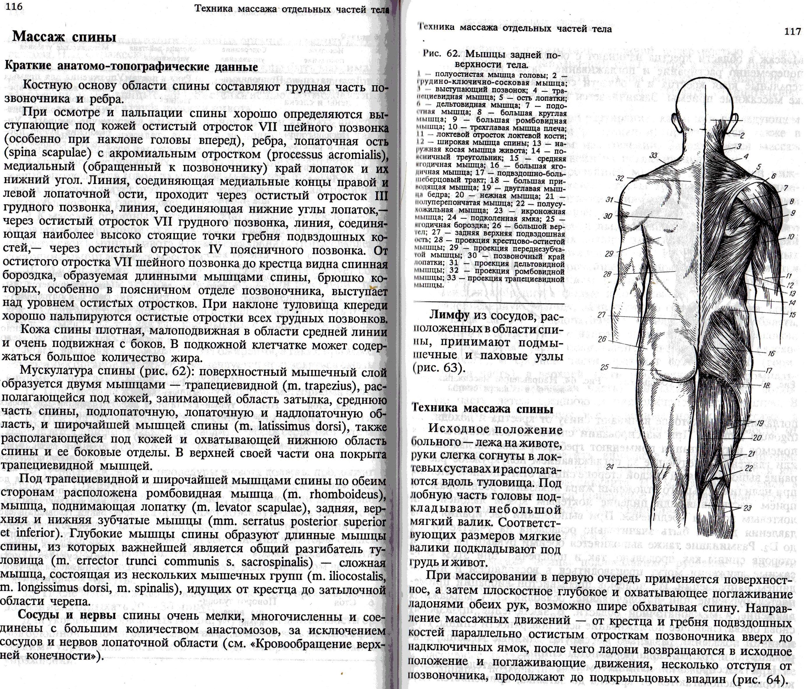 При наличии показаний раздельно массируют длинные мышцы, широчайшую и трапециевидную мышцы спины. При массировании длинных мышц-разгибателей спины, которые располагаются от крестца до затылка, применяется глубокое линейное поглаживание ладонной поверхностью больших пальцев обеих рук в направлении снизу вверх и сверху вниз. Как было уже указано, в области затылка массажные движения не должны быть энергичными, чтобы не вызвать отрицательных реакций у больного.