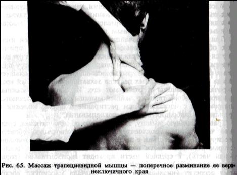 Особенно следует обратить внимание на верхнеключичный край трапециевидной мышцы, где очень часто наблюдаются явления миопатоза и миофасцикулита. Из массажных приёмов в данном случае применяется поперечное разминание (рис. 65), а также рубление попеременно с поглаживанием.