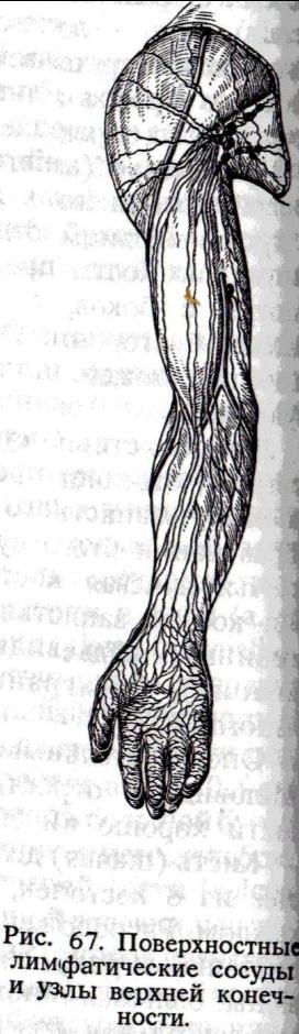 Лимфатические сосуды на верхних конечностях располагаются следующим образом (рис. 67): на тыльной и ладонной поверхности пальцев они проходят поперечно, достигая их боковых поверхностей, затем поднимаются к ладони, с ладони сосуды переходят на предплечье и плечо почти отвесно вверх и впадают в truncus subclavius, пройдя предварительно через следующие группы лимфатических узлов: nodi lymphatici cubitale- в локтевом сгибе, nodi lymphatici brachiale- выше внутреннего надмыщелка, nodi lymphatici axillare- в подкрыльцовой впадине и по нижнему краю m. Pectoralis major. Этим же путём лимфатические сосуды верхней конечности отводят лимфу к подмышечным, а оттуда к надключичным и подключичным лимфатическим узлам.
